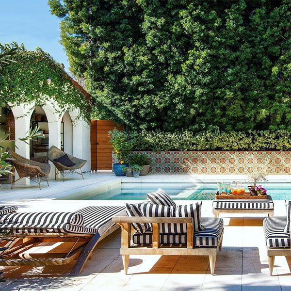 在拉美地区、巴西、墨西哥等国家,人们普遍喜爱马赛克瓷砖。采用马赛克装饰图案可以获得粗狂洒脱、和谐安宁并且与大自然环境和谐共生的体验。我们来借鉴这一异域风情化的造景风格,可以结合到庭院局部的铺装地面、种植池、小矮墙等元素。它仿佛让我们暂时远离国都,去神秘而遥远的国家旅游了一番。条纹装饰与软装结合在一起,补充了异域风情体验和一定的现代氛围。